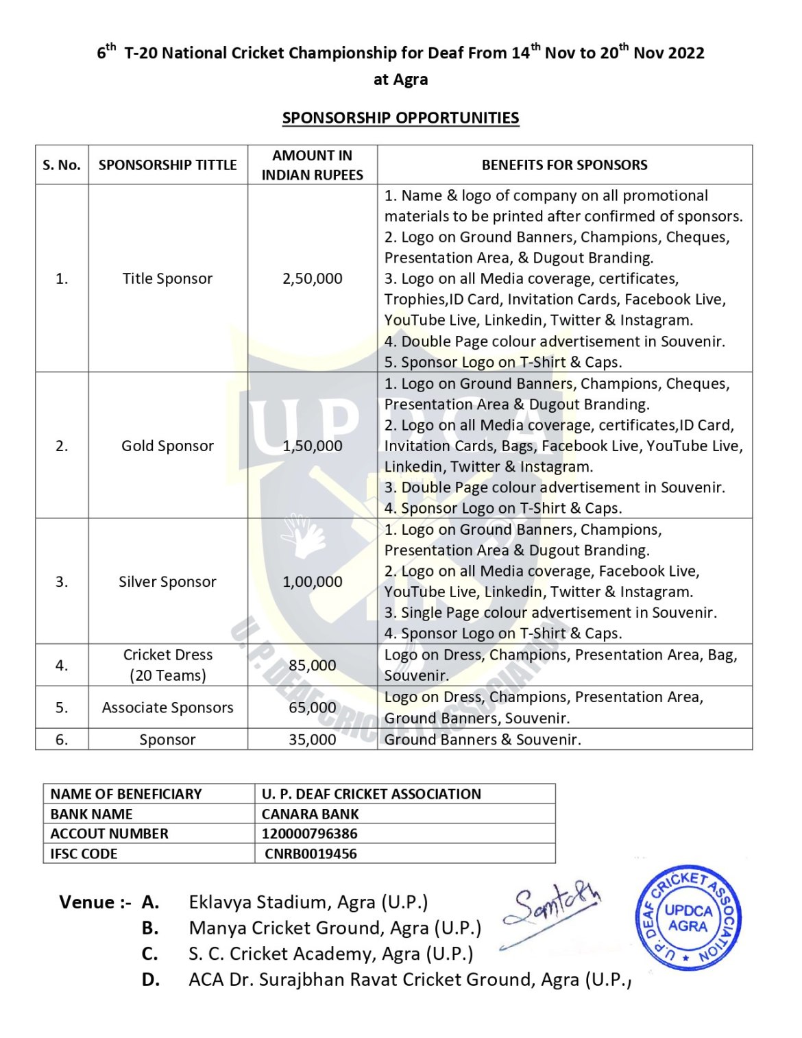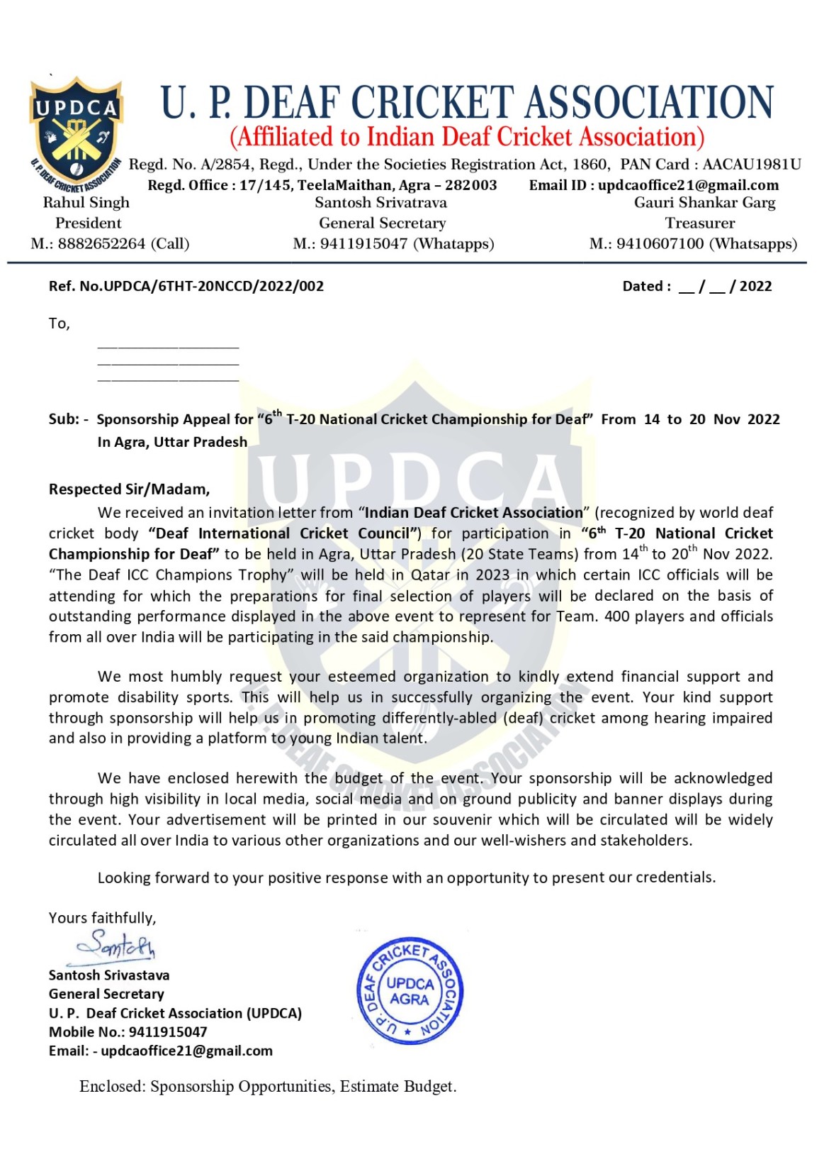 UP DEAF CRICKET ASSOCIATION (UPDCA) is thrilled to organize it's maiden national level tournament under the name of 6th T20 National Cricket Championship for the Deaf from 14th to 20th November 2022. Approximately 400 deaf cricket players along with their respective officials across the country will participate in the championship which in-turn will help to finalize the final squad for international tournaments and championships.