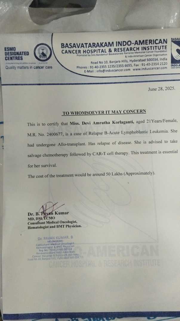 K. Devi Amrutha was diagnosed with acute blood cancer (leukemia) in November 2023. Since December 2023, she has been undergoing intensive treatment, including radiation therapy and chemotherapy, at Basavatarakam Indo-American Cancer Hospital.