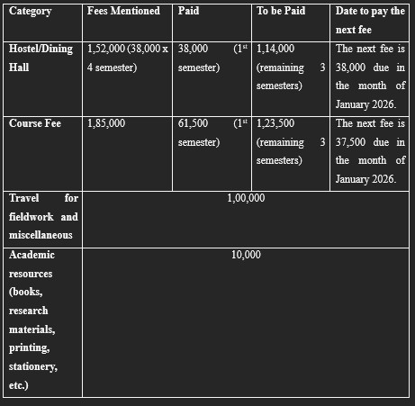 With all the support from friends, family and relatives, I did manage to get my registration fees, semester 1 fees and semester 1 hostel fee, but as limited financial support and challenges accessing scholarship and financial aid have made it difficult to pursue education without external support, I am unable to get the remaining fees for my 2-year program. Thus, I am seeking support for the funds I require for my master's degree. I am raising funds to cover the following: