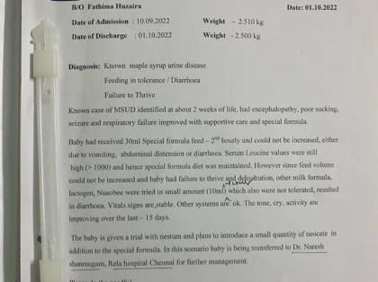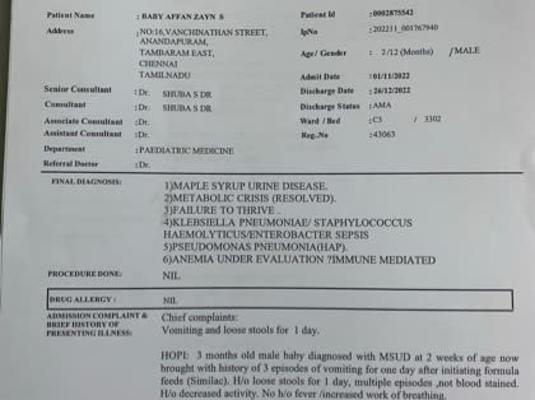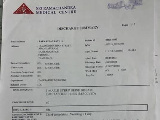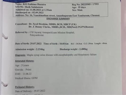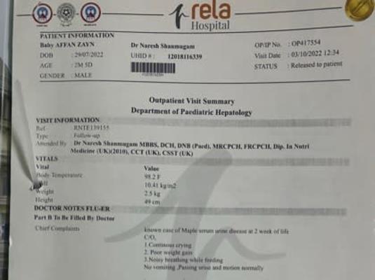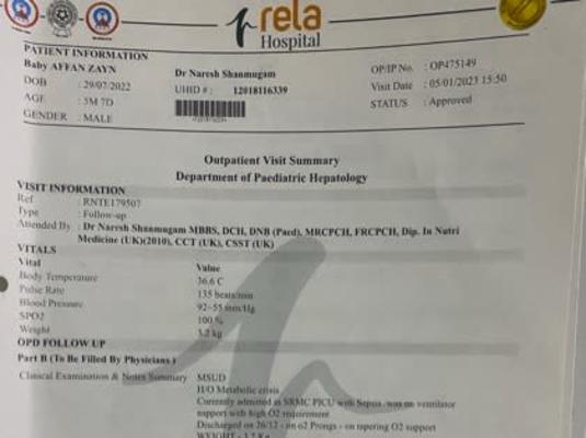 he was admitted more than 60 days in Royal Hospital (Thirunelveli). for further treatment they shifted affan to Dr Rela Institute and medical centre (Chrompet). After consulting with Liver specialist in Rela hospital they planned to shift Affan to Sri Ramachandra Hospital (Porur) to undergone treament with metabolic and neonatal specialist. On october 6 2022, admitted in Ramanchandra hospital. Since then he was undergone tons of medical examination and medication, but the main aspect to gain 5kg for liver transplant was not achieved yet due to the recurrent metabolic crisis. still now he hospitalized, more than 150 plus day he was hopitalized,and getting treatment.