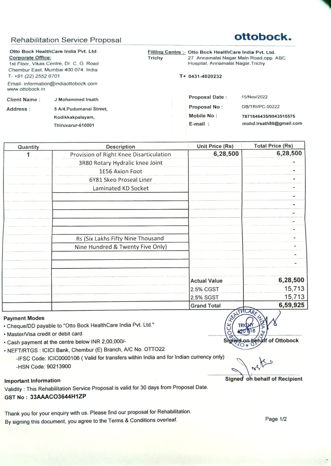 Am Mohamed Irsath 36/Yrs Photographer from Thiruvarur. 5 months ago a blockage in a blood vessel in my right leg left me with complete paralysis below the knee. The dysfunctional part was surgically amputated. The amputation process is done by Dr. Arunagiri (Vascular Surgeon) - at Kauvery Hospital, Trichy. We all know how legs are an important one. Now the injuries are fully healed and the prosthetic leg will be fitted in position. We approach a German Company called "Ottobock" for the Prosthetic leg. They give quotes for Rs. 6.60 Lakhs for that. Due to a lack of money, the work of implanting an artificial leg has been postponed. I don't have this many financial sources. So, I request your financial assistance. It helps me get back to normal. We plan to make payment before December 20, 2022. Payment. In case we missed the payment, the Price maybe 10 - 15% increased from the current Quote. Thanks in Advance. Here I attach the Quotation for the prosthetic leg.