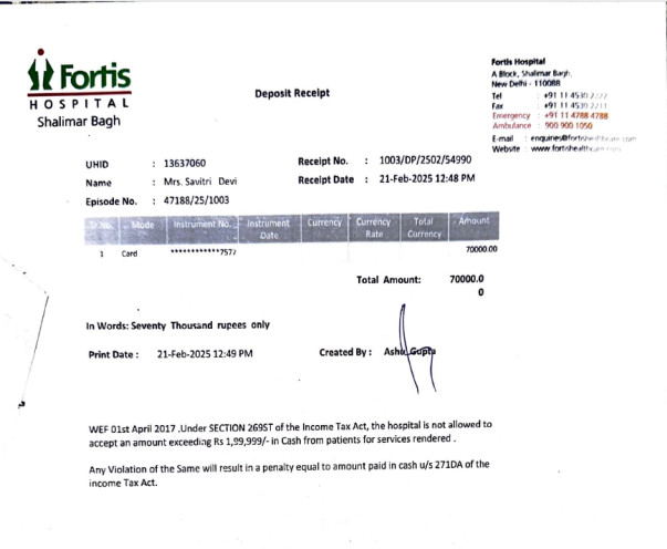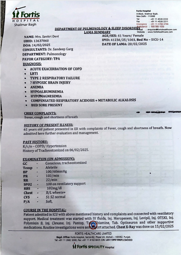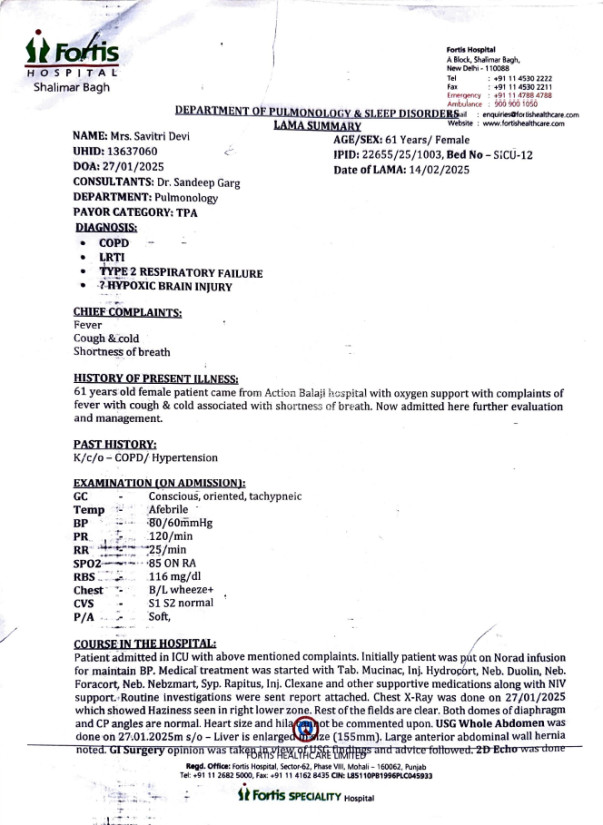 My name is Kanishka Goyal, and I am reaching out for my beloved mother, Savitri Devi (61), who is currently in a life-or-death struggle. Since January 26, 2025, she has been battling multiple critical conditions: Hypoxic Brain Injury, COPD, LRTI, and Type 2 Respiratory Failure. At this moment, she is on 100% ventilator support in the Surgical ICU at Fortis Hospital, receiving all possible life-saving treatments.