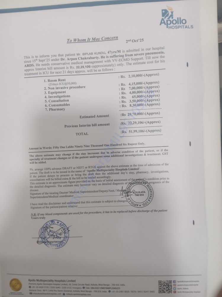 Seeing that the patient was not responding to any kind of treatment, the doctors finally after being left with no option, started ECMO (extracorporeal membrane oxygenation) on the patient, which is a life-support system that temporarily takes over the function of the lungs by pumping blood out of the body to an external machine that adds oxygen and removes carbon dioxide before returning the blood to the body. And thus, allowing the lungs to rest and recover. But this procedure is costly, and Biplab’s family, who recently suffered a financial drain owing to his mother-in-law’s treatment, has no means to continue the treatment.
