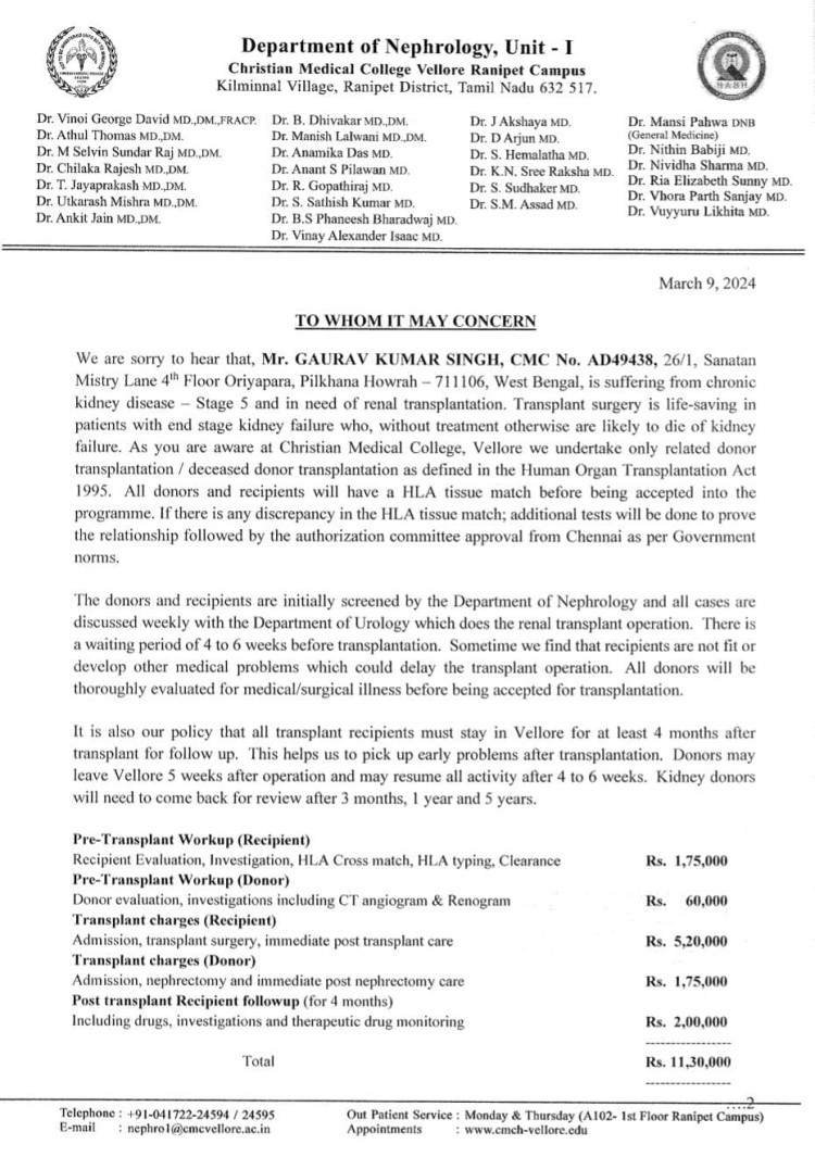 In Howrah, West Bengal, Gaurav Kumar Singh lived each day working as an employee at a private company, being the eldest son he became the pillar of support for his family. In November 2023, Gaurav's blood pressure abruptly shot up to abnormal levels, and his family immediately consulted the local physician. No one had expected it when after running the medical tests, he was diagnosed with stage 5 of Chronic Kidney Disease (CKD)