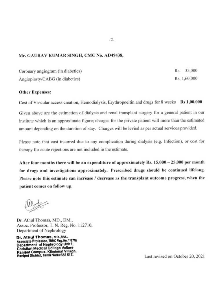 At stage 5 of chronic kidney disease, Gaurav's kidneys are failing to do their function, causing grievous deterioration of his health. The doctor has stated that the damage caused is irreversible and the only option left to help him survive is to get him a renal transplant also known as a kidney transplant. The cost of which along with the donor investigation, pre and post-surgery hospital supportive care, and his weekly hemodialysis is estimated to be more than INR 13 Lakhs, the cost which his family is struggling to shoulder on their own.