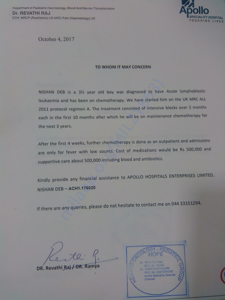 Nishan Deb lives with his parents Nani Bopal and Mamti Deb and his elder sister on the outskirts of Agartala. Two months back he had high temperature and cold. He had medications but still, it prolonged for 10 days. Then he started complaining of a backache and screamed in pain day and night. He was rushed to the hospital immediately and they were given the terrible news that Nishan is diagnosed with Cancer. His parents have moved all the way to Chennai to initiate treatment for him leaving their daughter in a relative’s house.