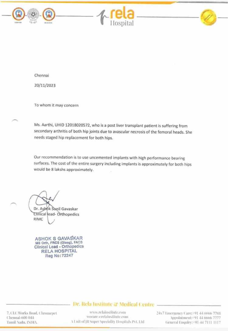 "Even though the liver transplant happened at a government hospital, we still had to shell out INR 10 lakhs for medicines, tests and other costs. She needed medicines after that too which cost money. I am happy to take care of my daughter until I die but I won’t be able to arrange the INR 8 lakhs needed for her hip replacement, please help me." - Venkatesan.