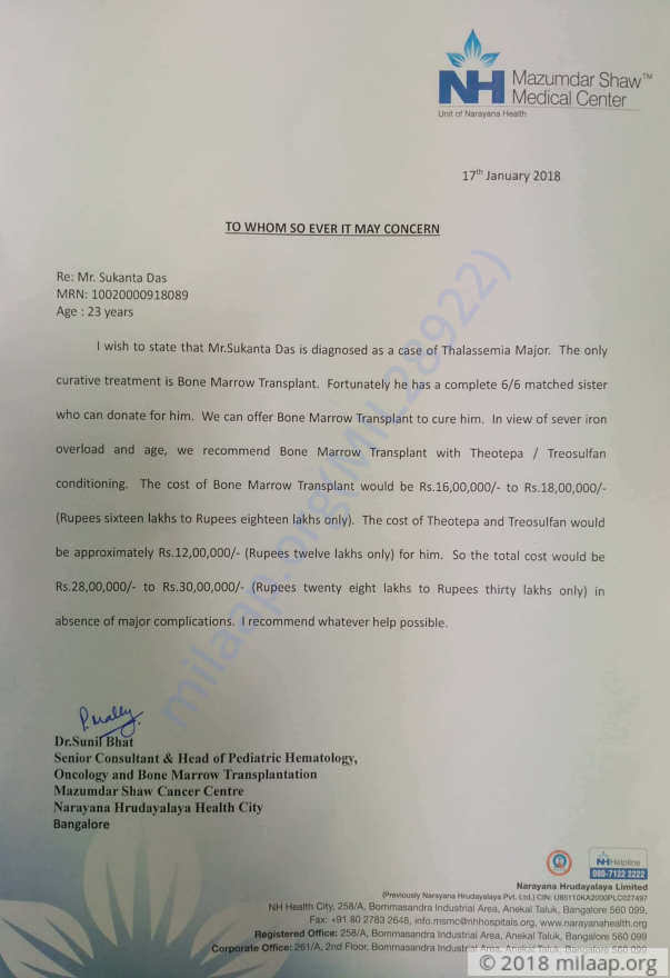 Sunil Das, Sukanta’s father, is a farmer who earns around Rs 6,000 every month. Sukanta’s mother, Mohina, is a housewife. They’ve done all they could to keep their son alive all these years. They’ve sold and sacrificed all their possessions and are now, helpless.The total cost of the bone-marrow transplant and further conditioning is estimated to be around Rs 30,00,000. Sukanta and his family, simply, can’t afford to pay for the life-saving transplant he needs.
